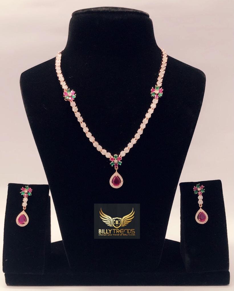 BILLY Trends Rose Gold Plated American Diamond Green & Pink Stone Studded Handcrafted Jewellery Set