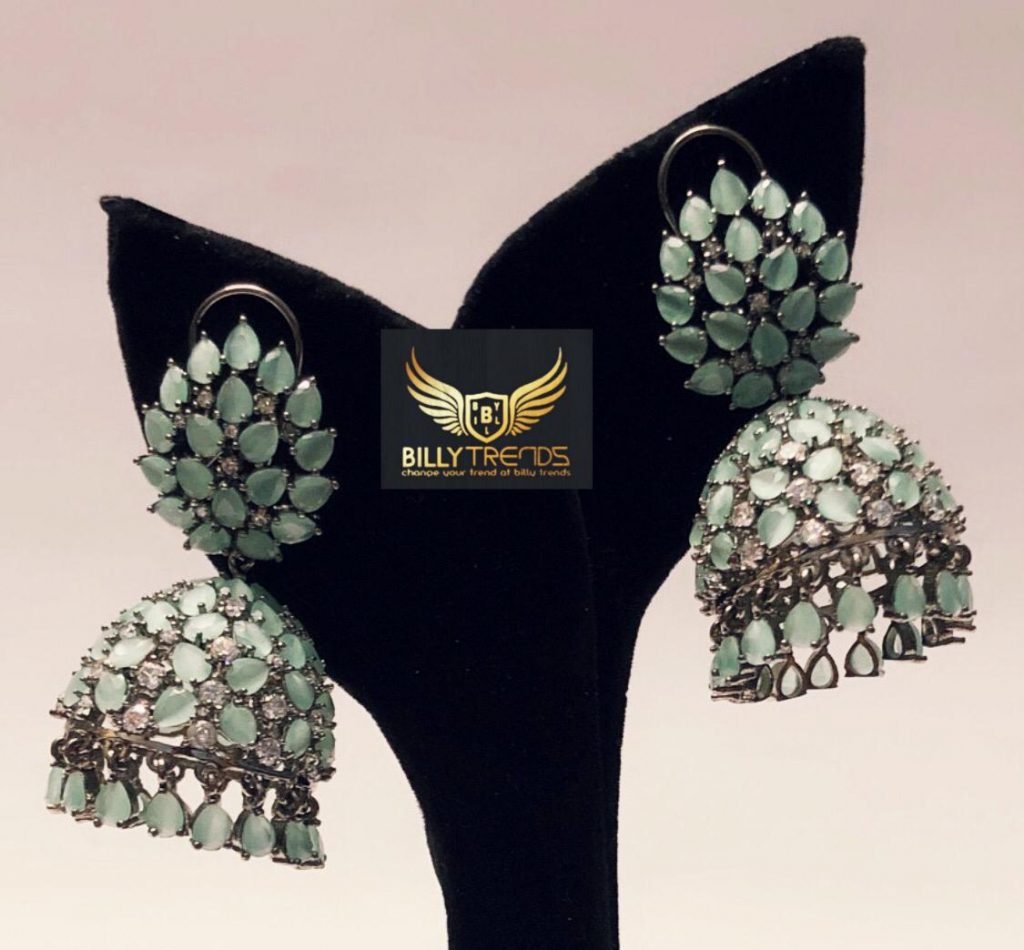 BILLY Trends Sea Green Gunmetal AD Studded Handcrafted Dome Shaped Jhumkies