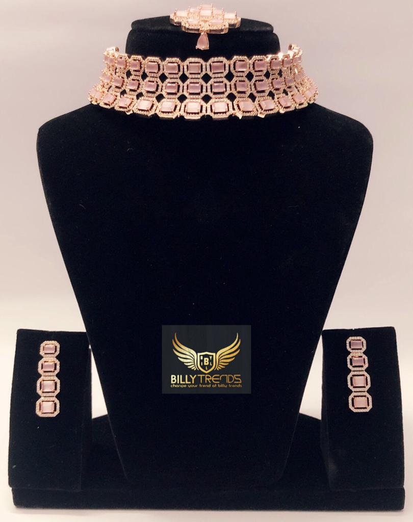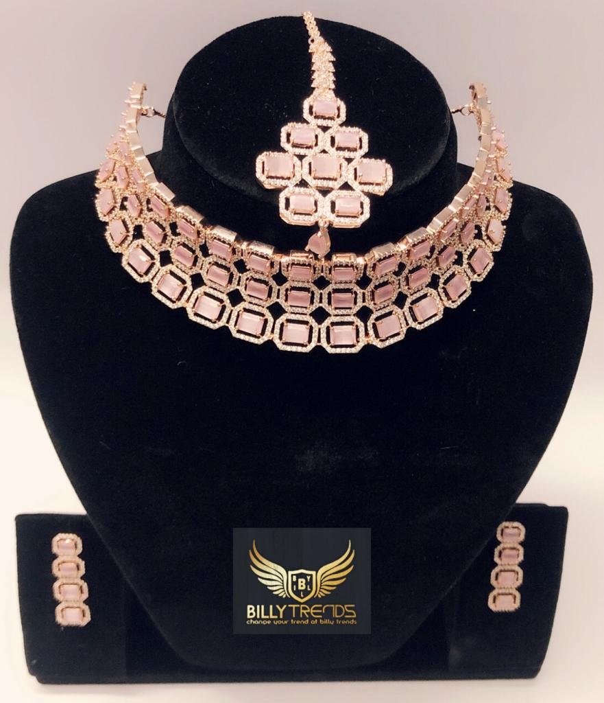 BILLY Trends Rose Gold Plated Pink Square Shape Stones & Cubic Zirconia Jewellery Set With Maang Tikka